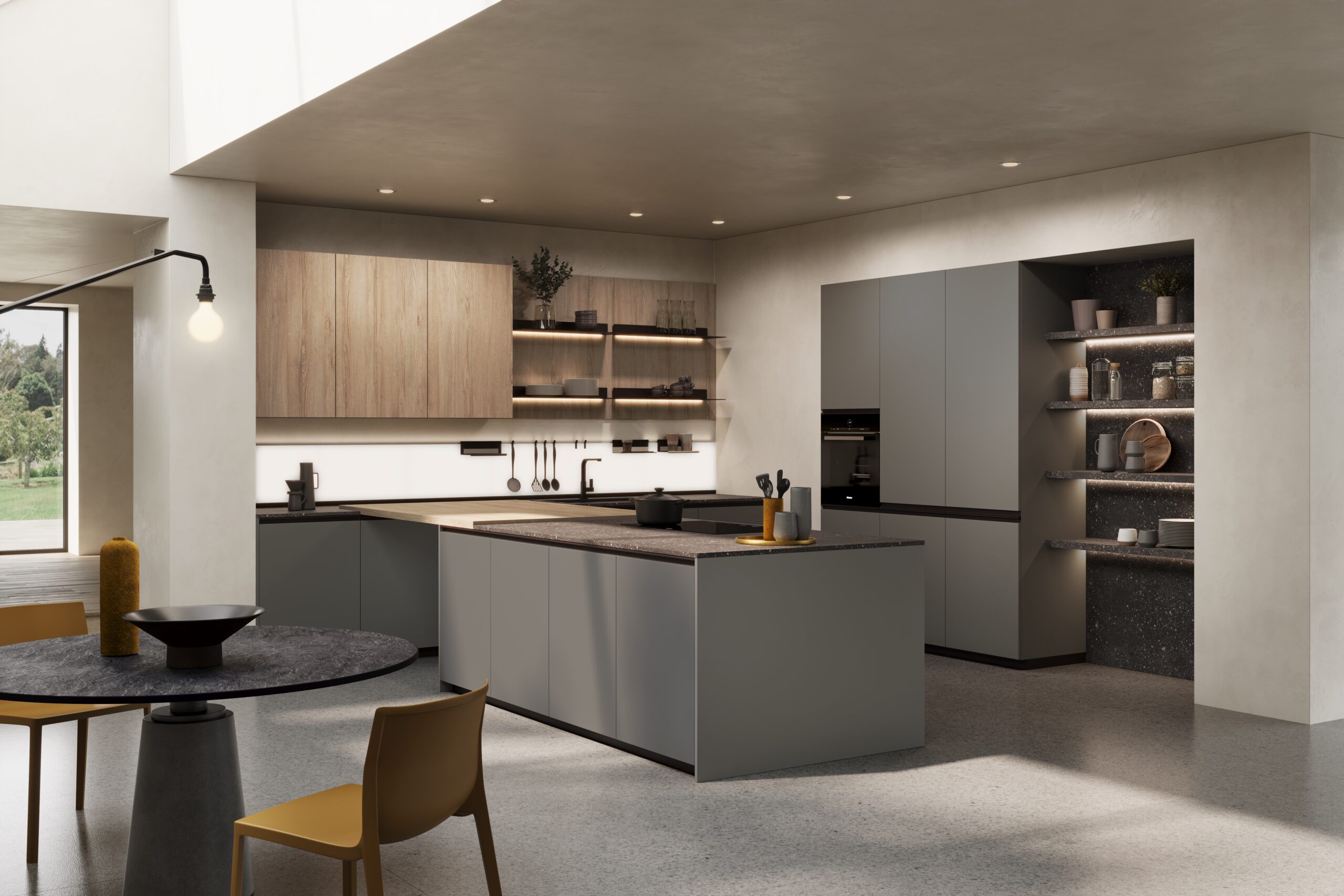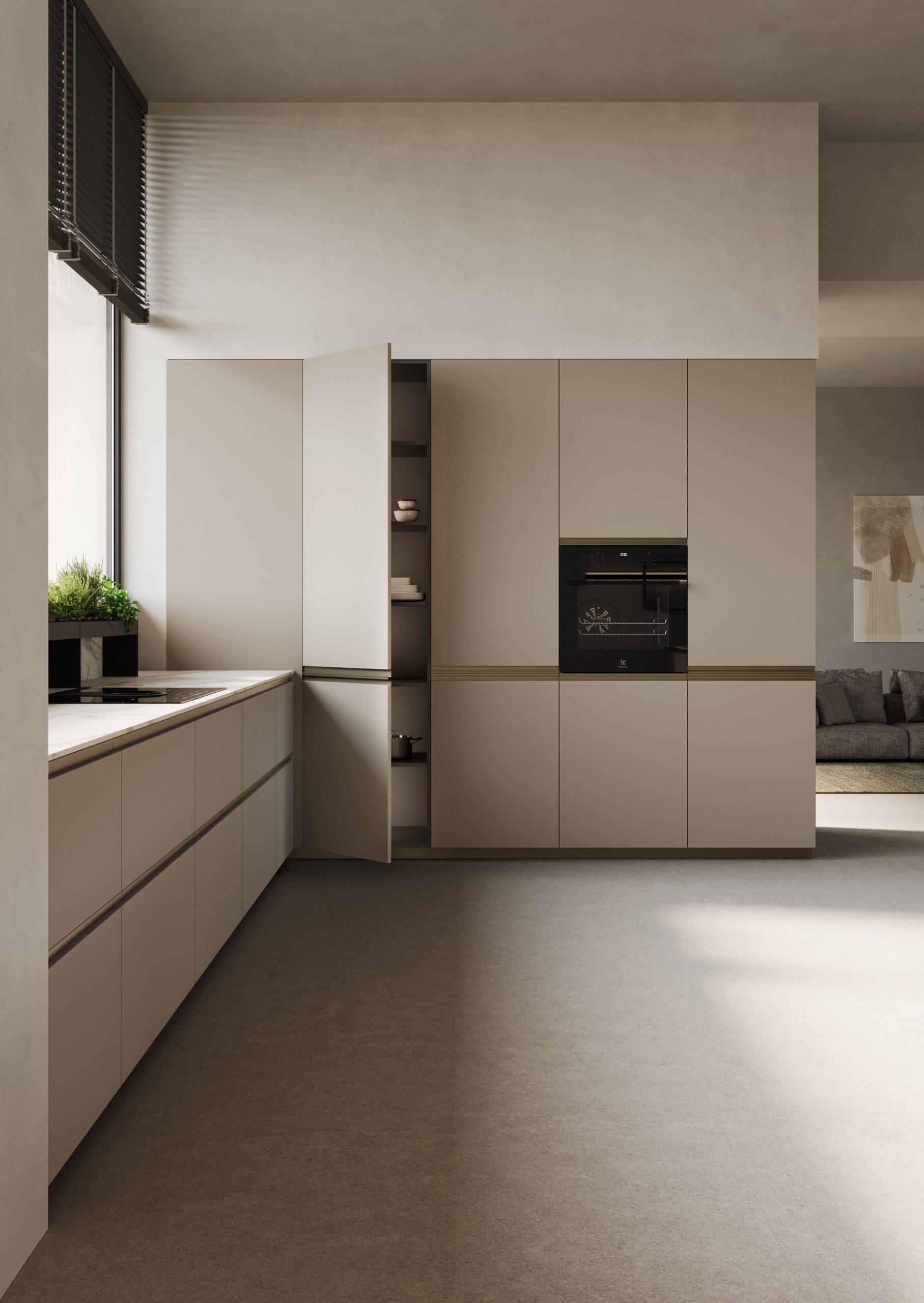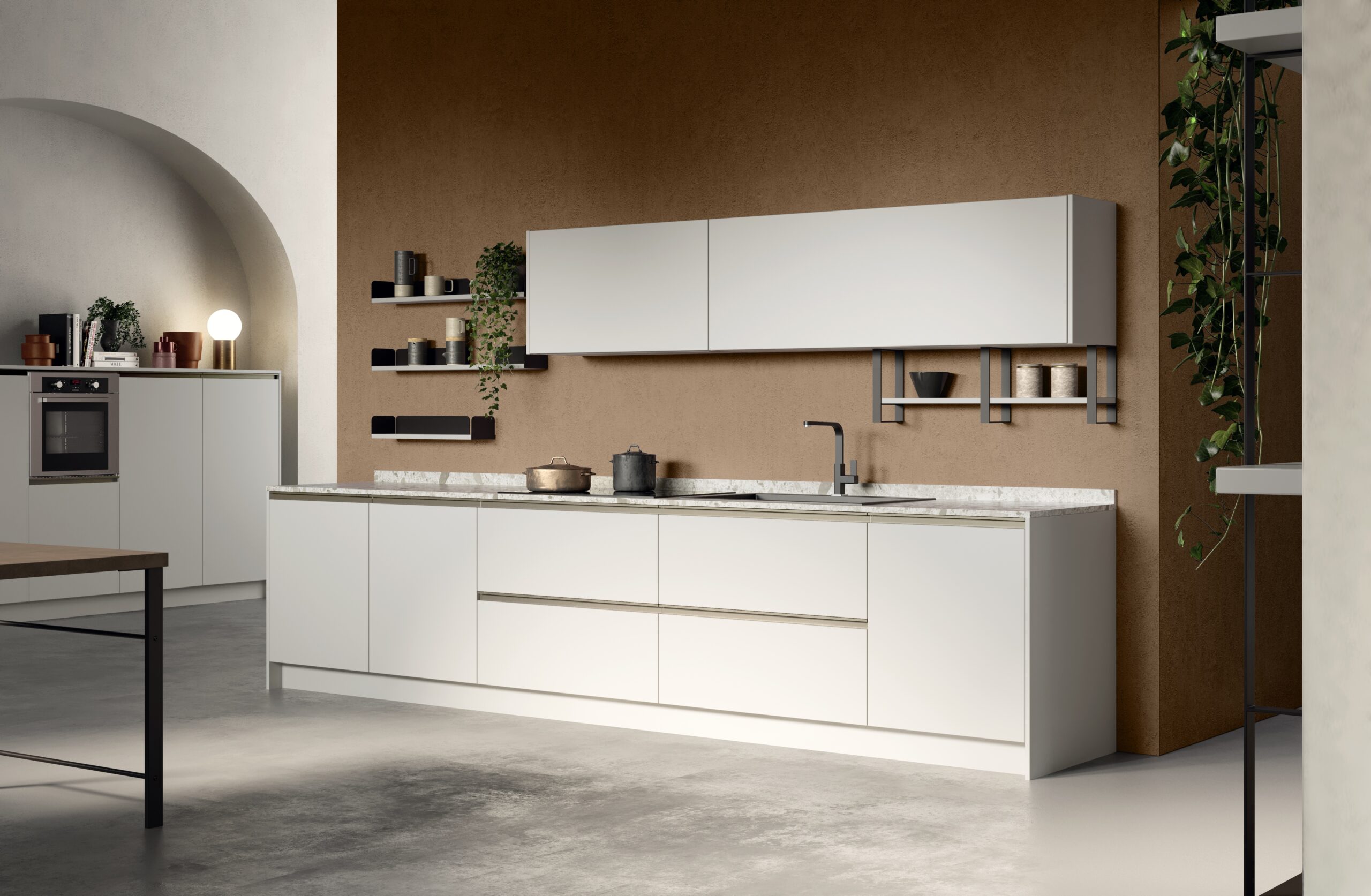 Le profil intégré est simple et jeune, ce qui rend la porte extrêmement pratique. Les contrastes des finitions permettent de donner forme à des compositions captivantes et concrètes. Des finitions fraîches et lumineuses comme la laque brillante, plus traditionnelles comme l’effet bois ou tendance comme l’effet pierre satisferont tous les goûts.